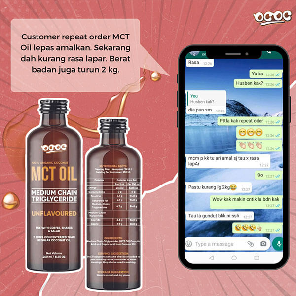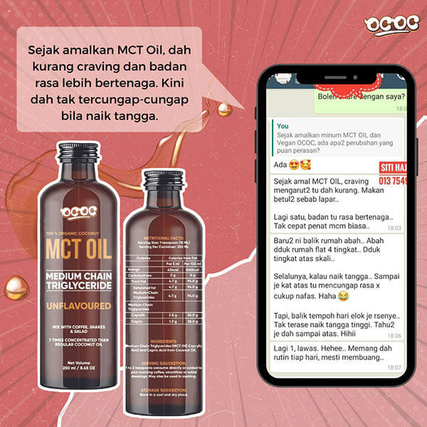 “Hanya Tambahkan satu sudu MCT oil dalam makanan atau minuman kegemaran anda seperti bijirin, sup, sos, jus, kopi dan teh.”